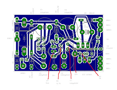 A droite la diode D9 et plus bas sous le condensateur IC1 le régulateur calé à 16.3 V, il n'est pas à la bonne place car il chauffe et doit être déporté sur le boitier avec un radiateur, 3 fils en plus.