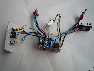 Les câbles sont recoupés et soudés sur les socles de prises et des interrupteurs ne pas oublier de mettre des petits manchons thermos-rétractables.Le soudage des 6 broches du socle mini DIN est le plus délicat. A droite IC1 vissé sur son radiateur. Ce radiateur est nécessaire en fin de charge lorsque la tension de charge atteinte, le courant se réduit, IC1 doit dissiper le surplus.