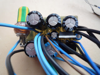 A gauche sous le capuchon vert, l'interrupteur thermique S1 qui protège la diode D5 (suppressor voltage), celui-ci est fixé sur la diode enroulant serré du fil de cuivre, le tout isolé par du silicone et un bout de thermo-rétractable.( l'interrupteur est fourni avec le circuit imprimé)