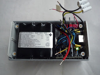 Il reste 4 fils à brancher sur le domino, mettre un petit rectangle de mousse sur la batterie, un dernier coup d'œil sur le bon ordre du câblage et vissage du couvercle, le boitier chargeur est terminé.